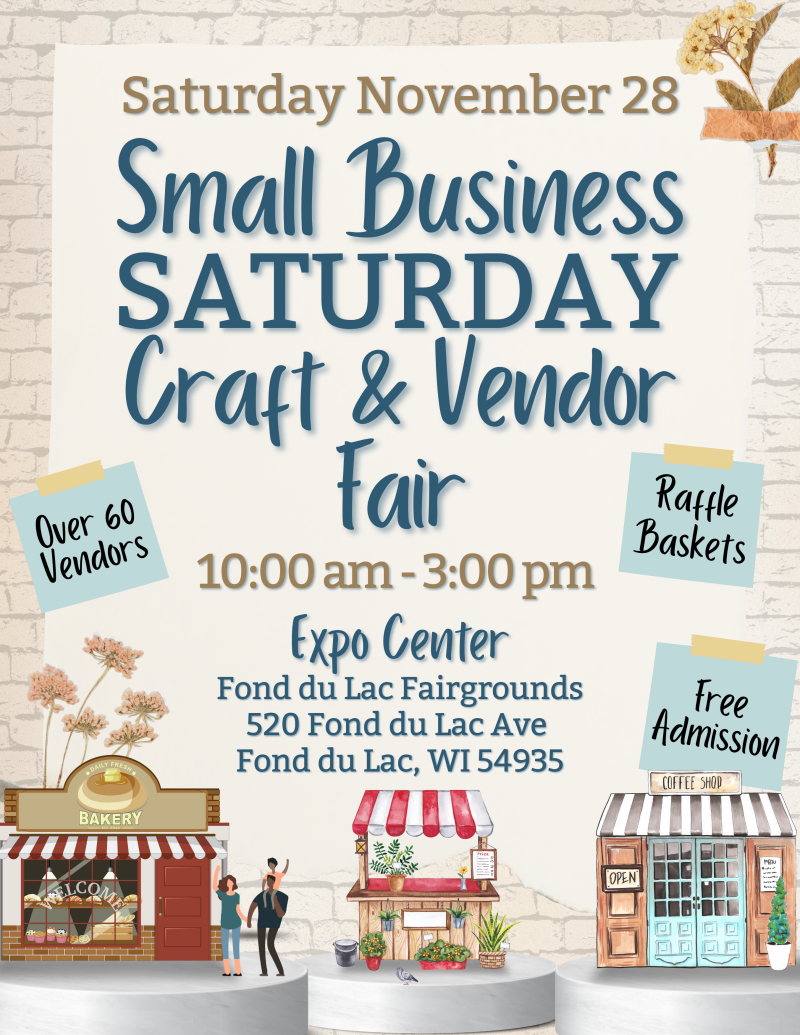 Join us for the Small Business Saturday Craft and Vendor Fair on Saturday, November 28th from 10am - 3pm, at The Expo Center - Fond du Lac County Fairgrounds in Fond du Lac. Shop local for Small Business Saturday, this is the perfect place for getting ahead on holiday gifts or treating yourself to something cozy!